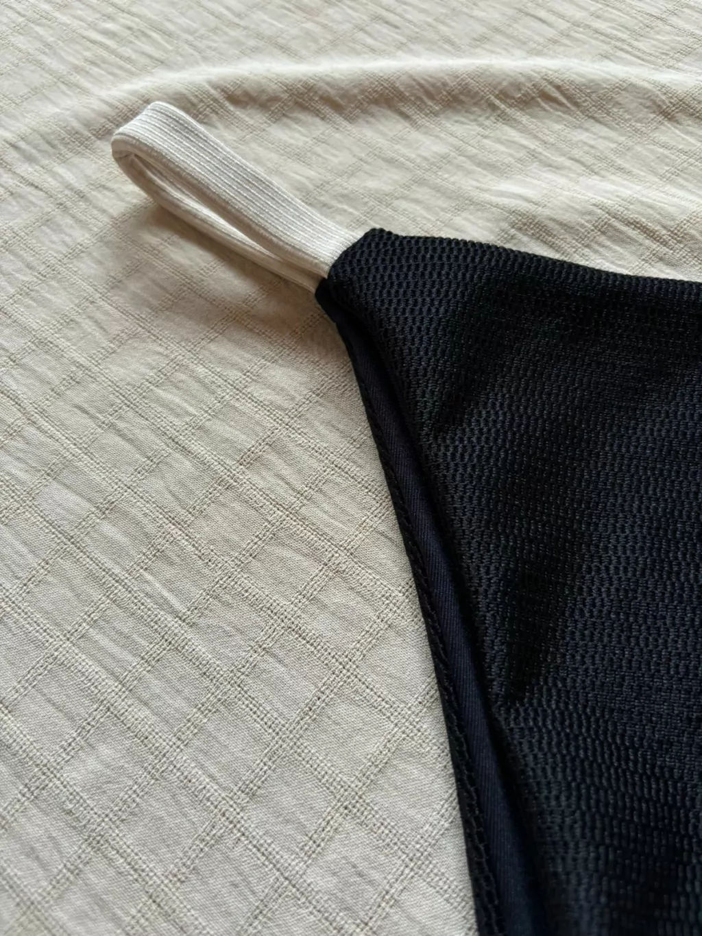 Nosso modelo cortininha é pra quem ama uma marquinha, cenfeccionado em tecido texturizado na cor preta com detalhe em viés nude. Calcinha modelo fita, tecido em dupla camada com secagem rápida e proteção UV 50+