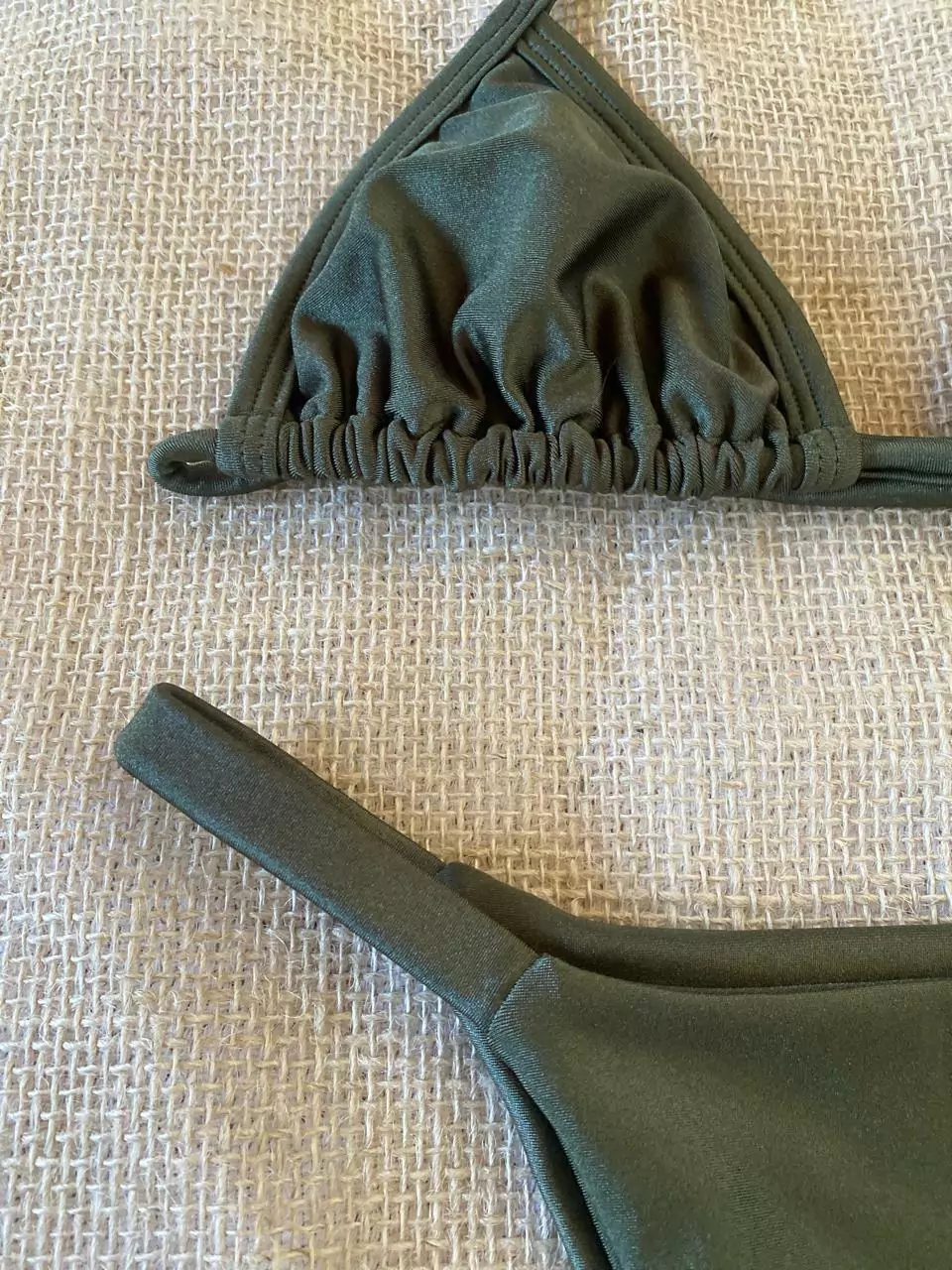 Modelo calcinha fita na cor verde cirrê, tecido com leve brilho proporcionando um visual elegante e moderno. Tecido em dupla camada com secagem rápida e proteção UV 50+