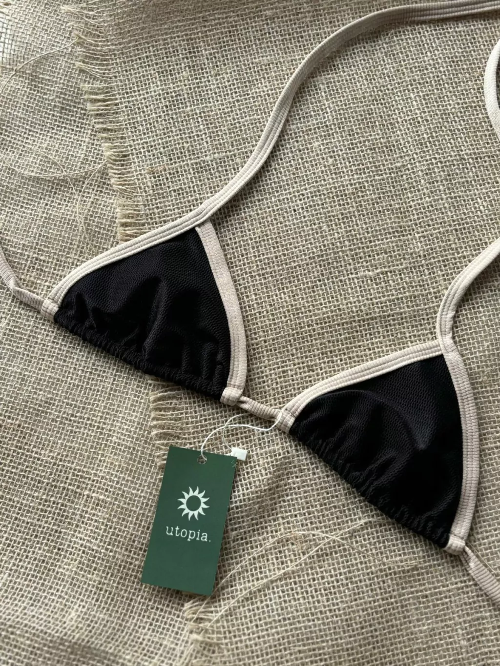Nosso modelo cortininha é pra quem ama uma marquinha, cenfeccionado em tecido texturizado na cor preta com detalhe em viés nude. Calcinha modelo fita, tecido em dupla camada com secagem rápida e proteção UV 50+